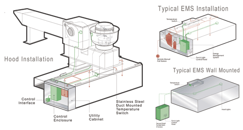 Operation of the Energy Management System (EMS) is based on a modulating principle where the fans modulate based on the duct sensor temperature reading. A ductmounted temperature switch constantly monitors exhaust air temperature and forces the system to adjust speed thus saving energy in idle mode. Low speed is factory set to reduce airflow by 20%. For extended heavy cooking timeframes, a 100% airflow override option and adjustable timer (factory set at 30 minutes) are supplied.