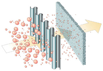 Baffle removes large particles while packed bed captures small particles.