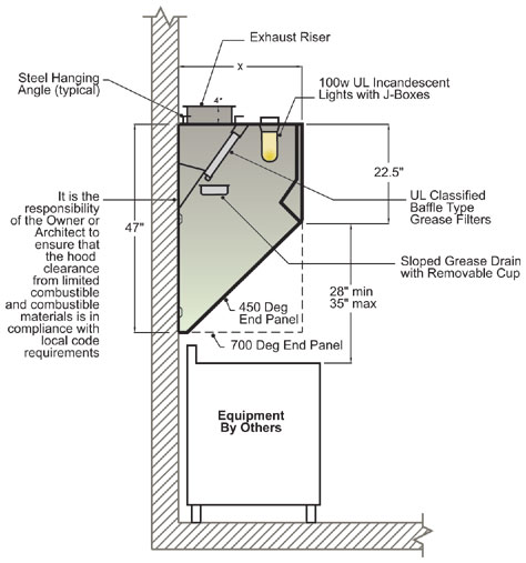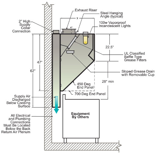 - Optional integral air space provided to meet NFPA 96 clearance requirements against limited combustible wall; optional, insulated NFPA 96 approved air space available for combustible wall.